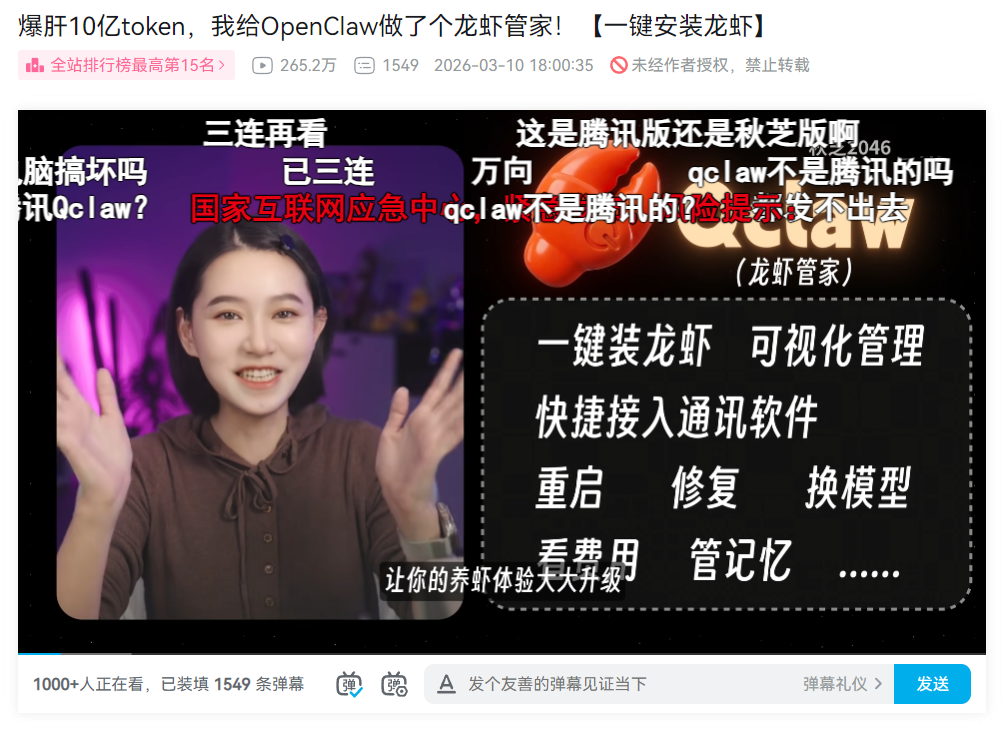 比如,最近在圈内名声大噪的极客博主 “秋芝2046”,当别人还在打嘴仗时,他的产品 Qclaw(龙虾管家) 在内测预告期就已经陷入了疯狂:B站后台“Q”关键词回复量突破 15万+次,内测预约人数高达 10万+,全网搜索指数狂飙 2000%+,社群日均消息量突破 10万+。