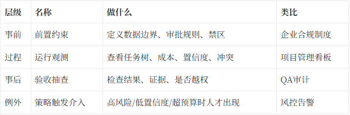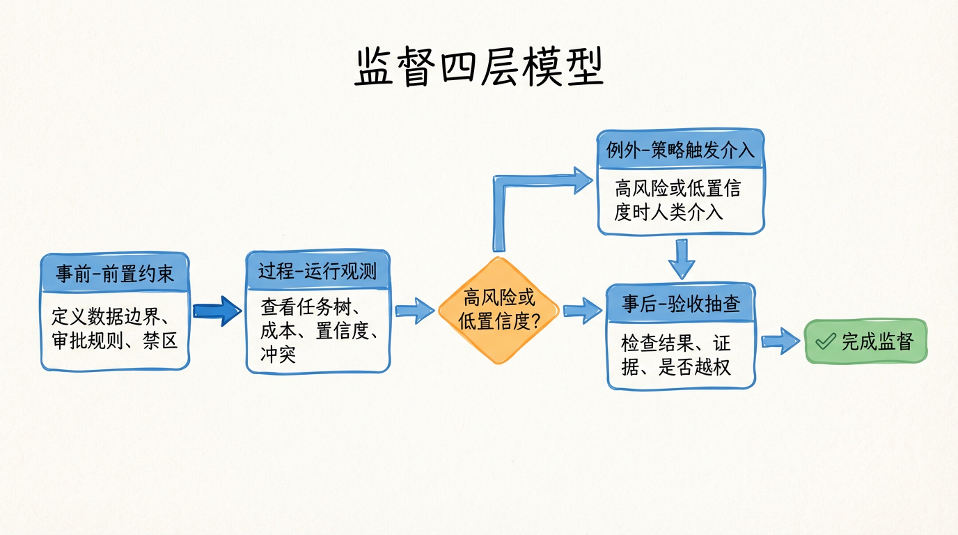 但要警惕一个问题:监督不能无限套娃。低风险任务抽样监督,中风险规则+事后审计,高风险多重监督+人类审批。