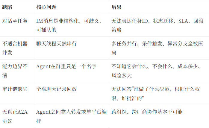 这5个问题不是”体验不好”的层面,而是结构不支持的层面。就像你不能用Excel来做ERP一样,你也不能用聊天群来做多智能体协作系统。