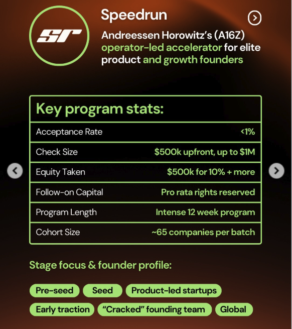 - 深度洞察:申请 Speedrun 的录取率极低,经常低于 1%。a16z 想要的是那些已经准备好起飞的团队,他们不仅要你懂技术,还要你极其懂产品增长。