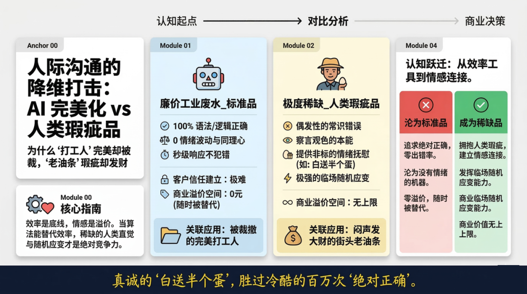 换句话说,现在的商业世界,谁能制造那种带着泥土味的“人造摩擦力”,谁能提供那种无法被代码定义的“不可计算的人情味”,谁就能站着把钱挣了。而那些还在试图把自己训练成“完美做题家”的打工人,注定要被扫进历史的垃圾堆。