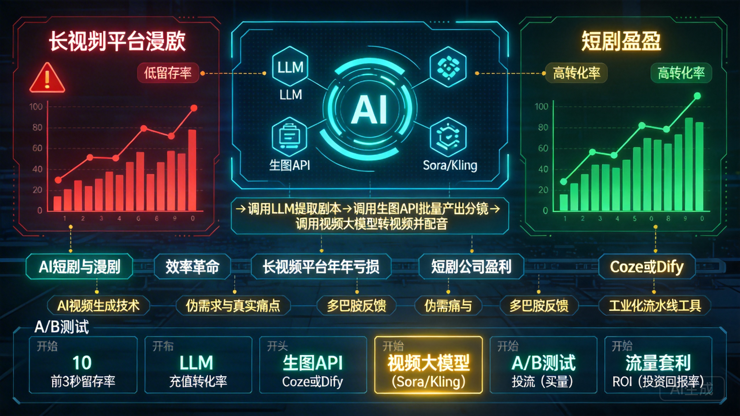 极致的A/B测试: 在投流(买量)阶段,利用AI生成同一剧情的10个不同开头,同时投放市场。哪一个前3秒留存率高、充值转化率高,就立刻把全部预算砸向哪一个。