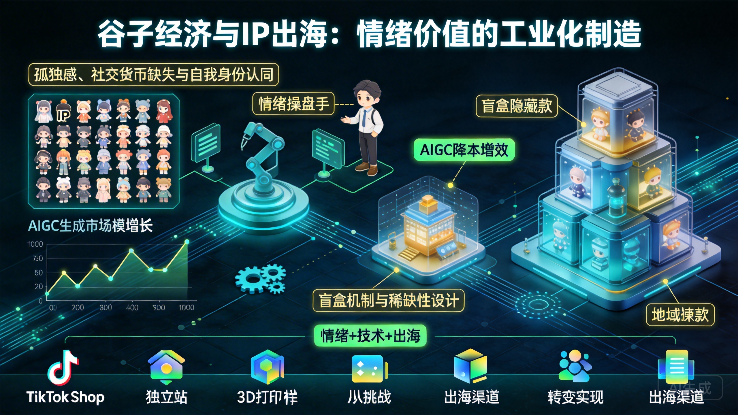 跑通“情绪+技术+出海”的铁三角。前端用内容(动漫、游戏)捕捉情绪并形成IP;中端用AIGC和柔性供应链极致压缩生产成本;后端利用中国成熟的出海渠道(如TikTok Shop、独立站)将潮玩倾销全球,赚取发达国家的“情绪溢价”。这也是为什么泡泡玛特能在海外重塑千亿市值的核心逻辑。