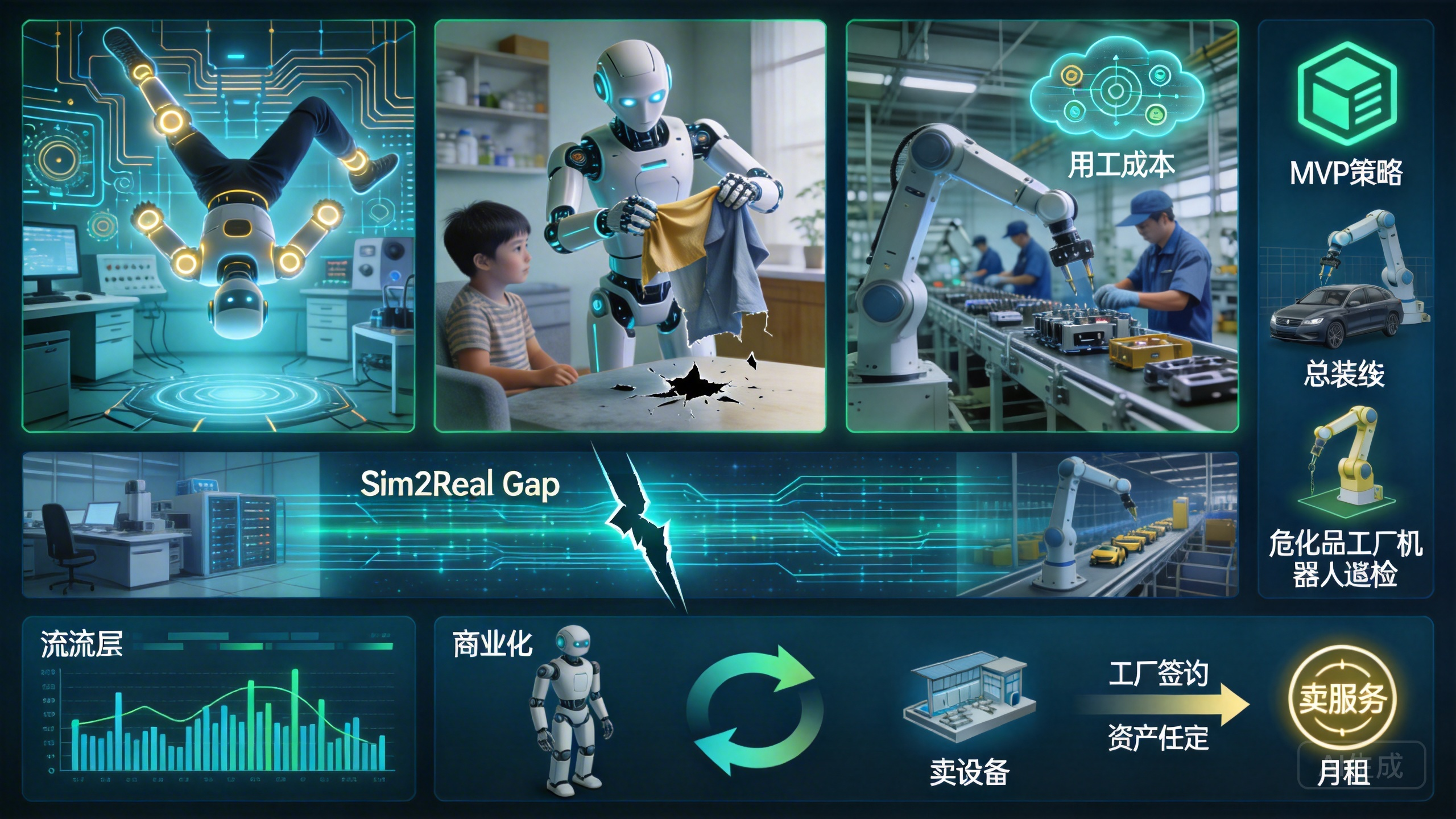 MVP策略: 不要追求一出厂就能干100种活。先锁定极度垂直的场景,比如:汽车总装线上的零件分拣、危化品工厂的巡检。让机器人在真实的物理反馈中试炼智能(基于物理世界模型的具身智能)。
