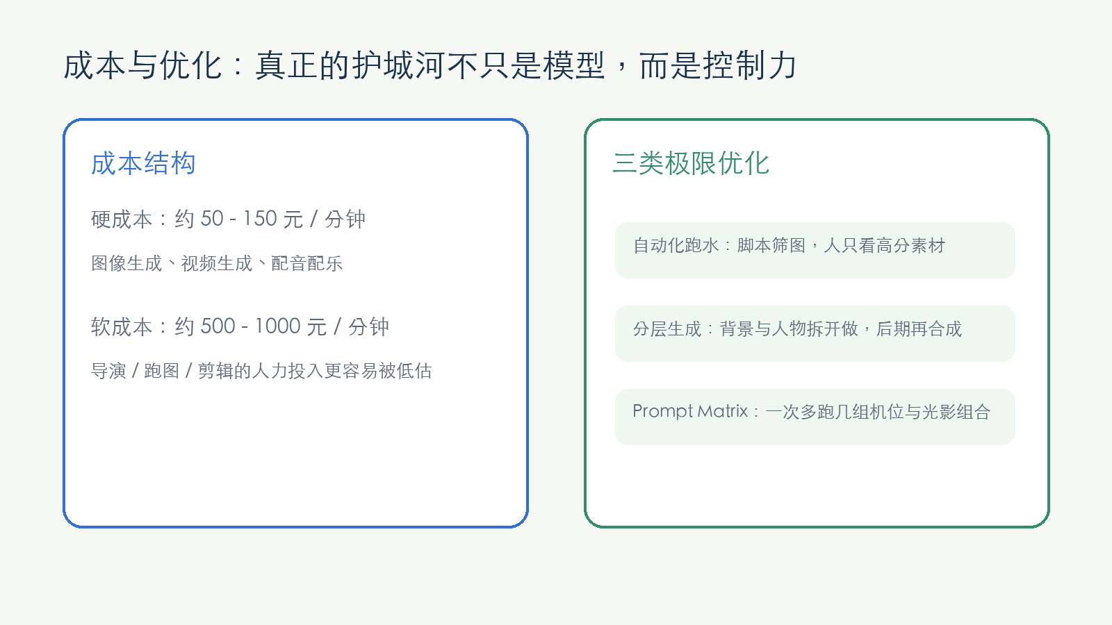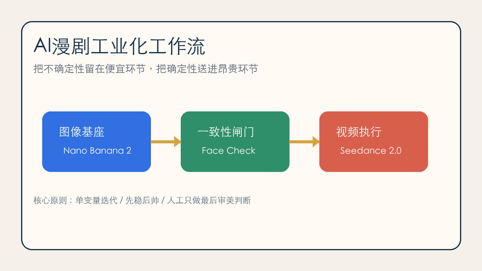 在今天的 AI 内容赛道,真正的壁垒早已不再是“我们会用某个最新的模型”。模型每个月都在更新,工具终将走向平权。真正能让团队在这个内容工业体系里活下来并建立护城河的,是这套“把不确定性挡在低成本环节”的控制逻辑。
