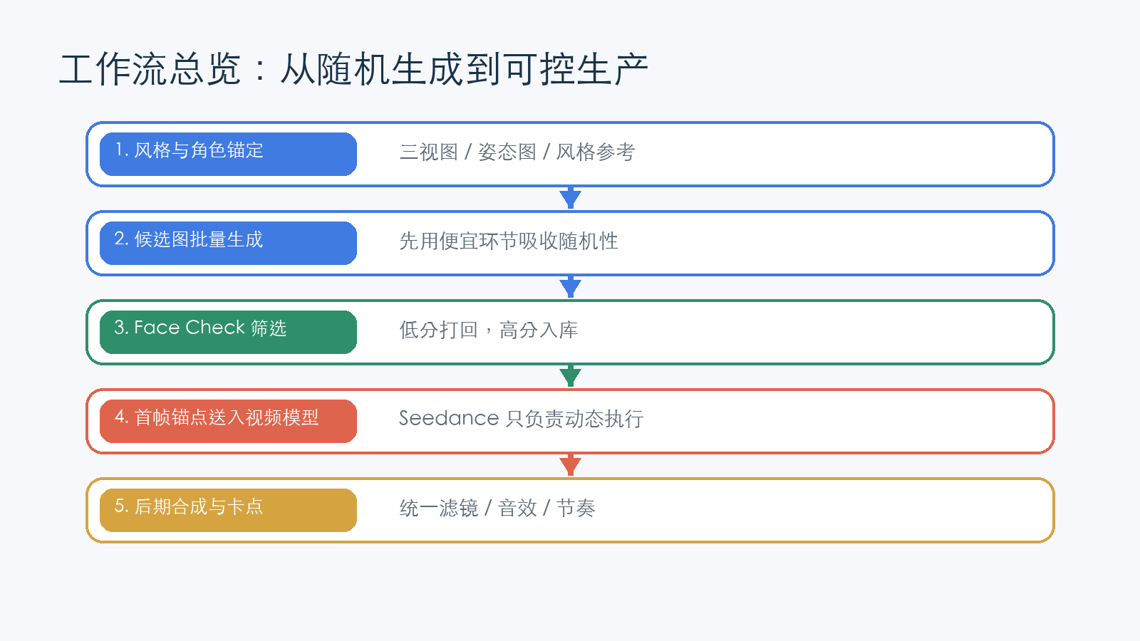 成熟的团队不会试图用一个全能模型去一键替代传统流程,而是对管线进行冷酷的“解耦”:将风格定调、人物统一、姿态约束等动作极度前置;将试错、废片和修补工作,死死按在算力低廉的图像生成阶段;最终,把真正消耗巨大算力与时间的动态视频生成,只留给那些已经经过层层验证、具备极高确定性的底图素材。