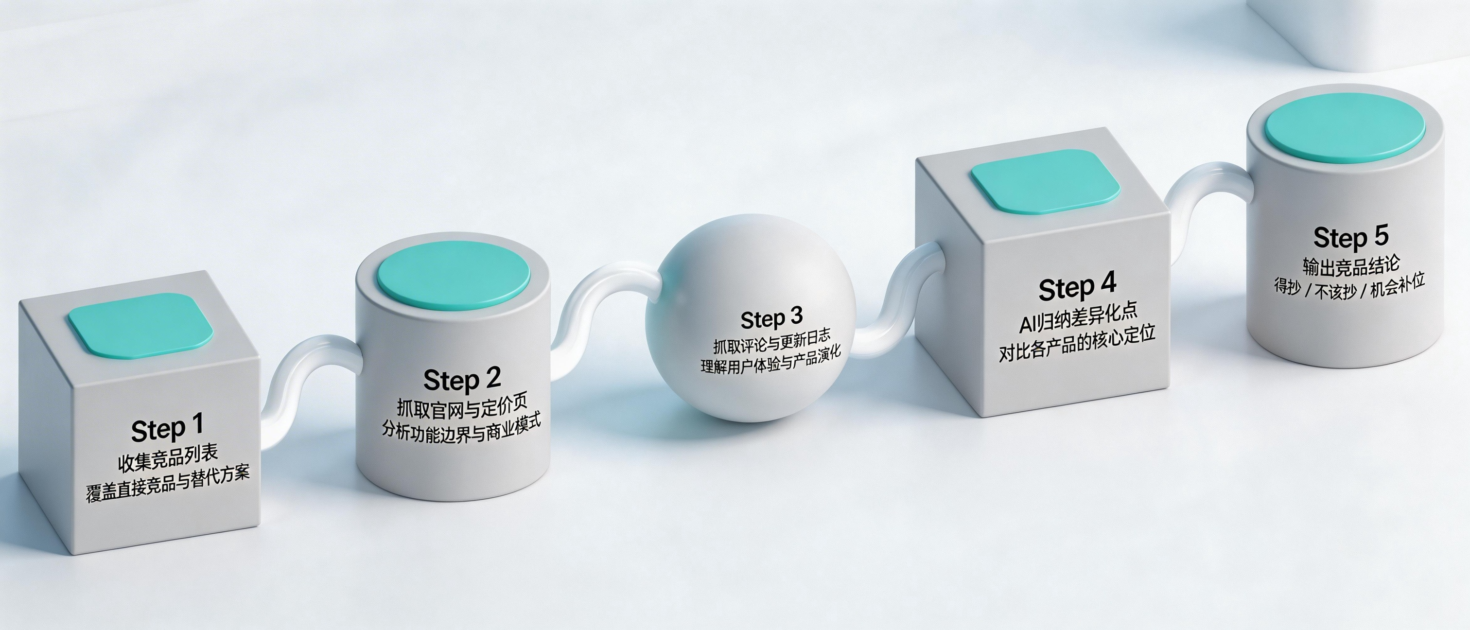 这个流程的最终输出,不是一张功能表,而是三个判断:值得借鉴什么、哪些做法不该复制、哪里存在可以补位的机会缺口。