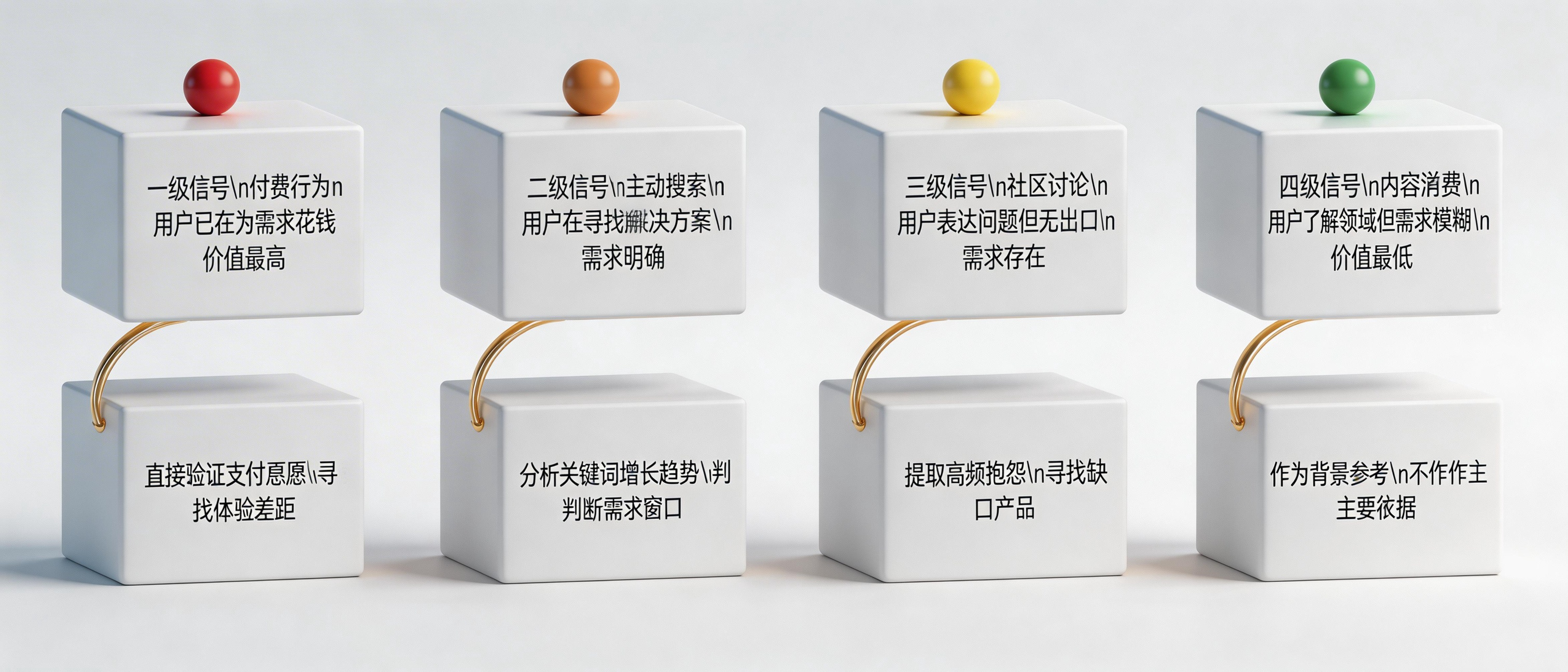 并非所有信号的价值都相同。在用AI大规模抓取数据之前,需要建立一套信号强度的判断框架,否则很容易被大量低价值噪音淹没。
