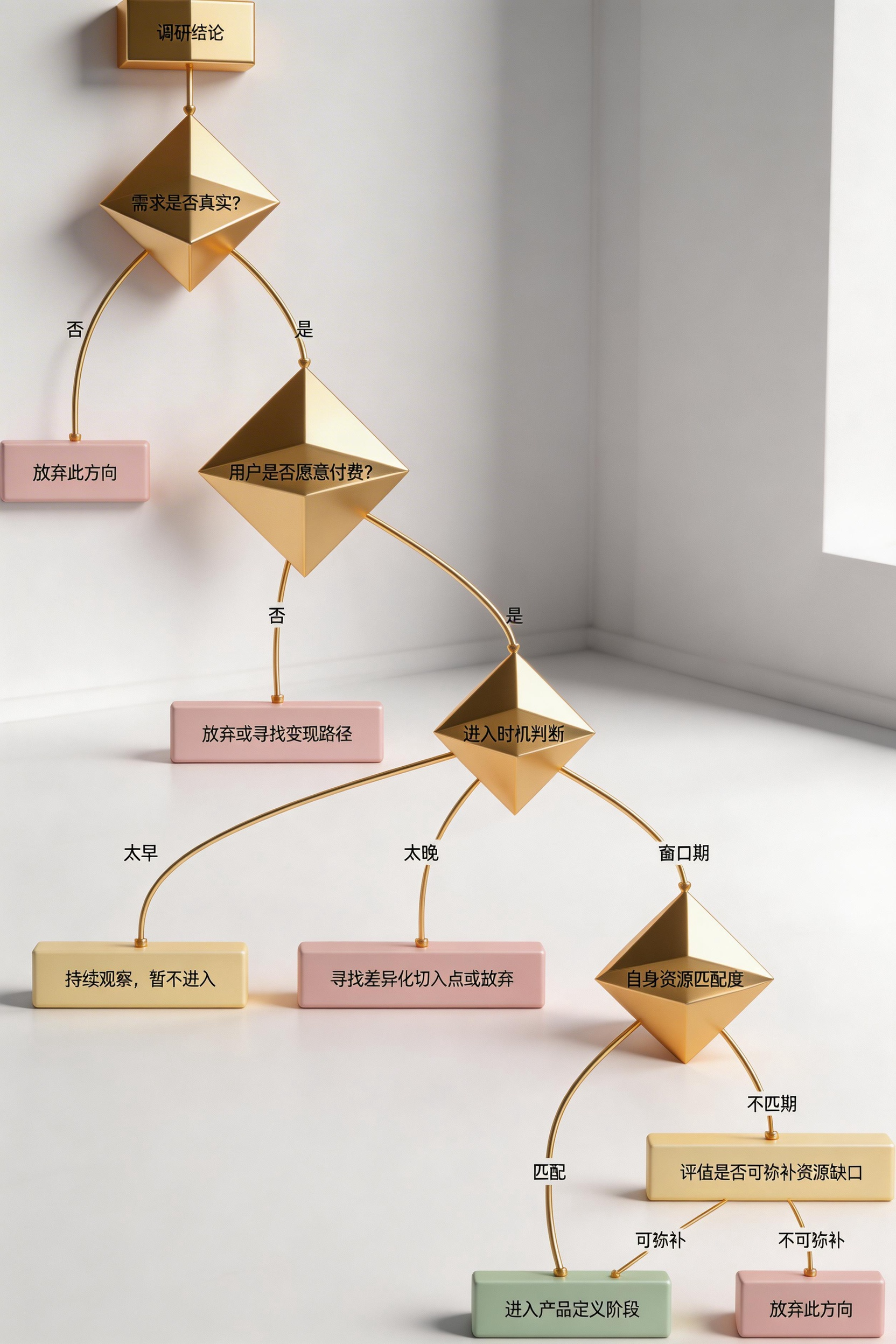 调研做完了,信号也看到了,但这不等于可以直接开始做产品。这一步是整个流程中最容易被跳过、但最不应该被跳过的环节:机会确认。