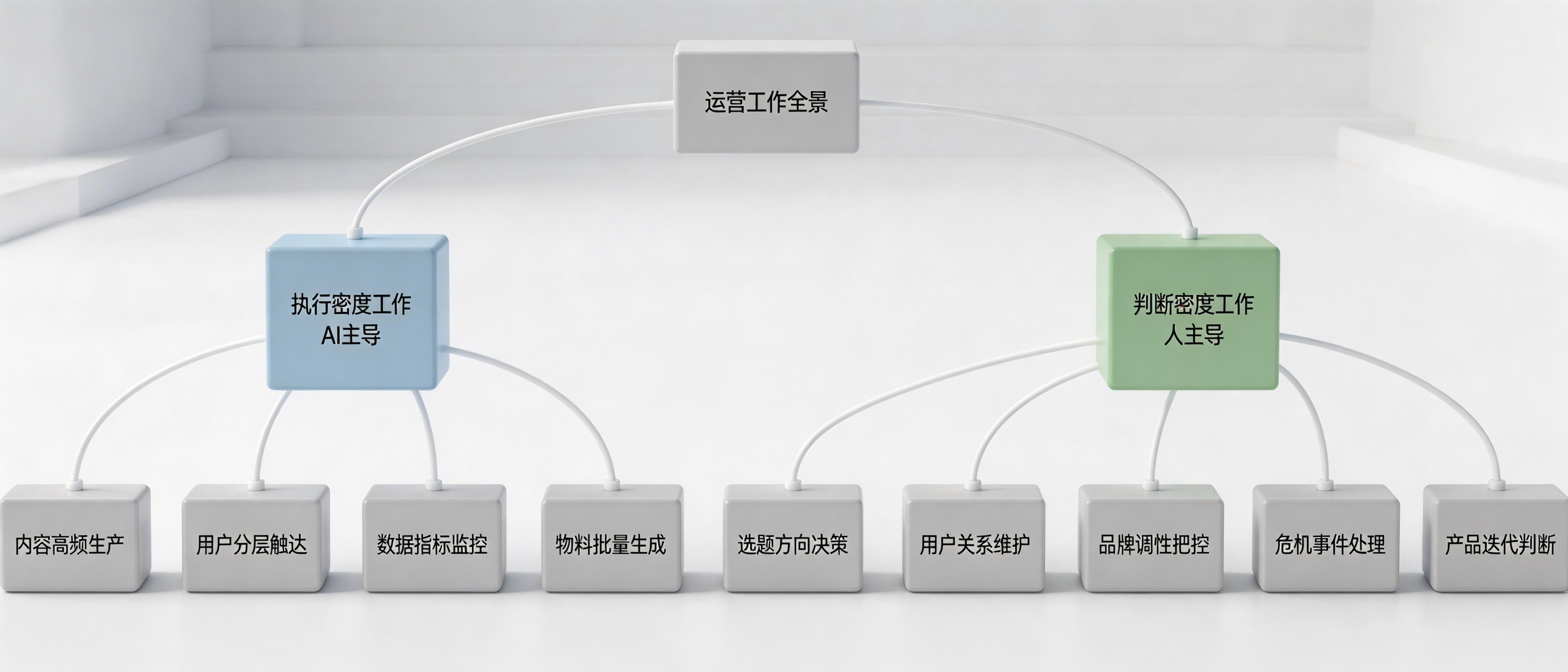 全章的核心分工原则是:AI负责执行密度,人负责判断密度。 AI承担高频、重复、规模化的内容生产与分发工作;人承担选题方向、用户关系、危机处理、品牌调性等需要判断和情感智慧的工作。这个分工不是技术限制,而是战略选择——把人的时间集中在AI无法替代的判断环节,才能最大化整个运营体系的价值产出。