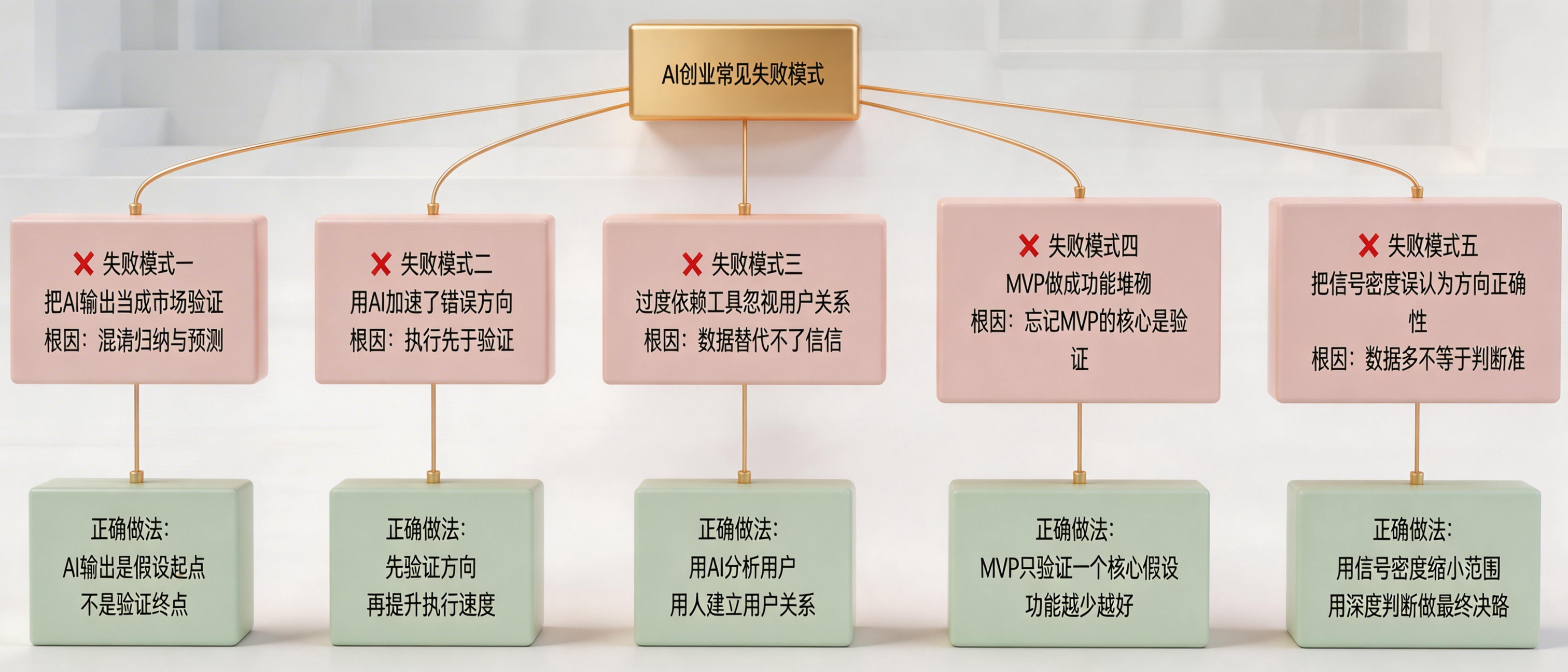 这一章专门讨论五种在AI创业浪潮中最常见、也最容易被忽视的失败模式。它们的共同特点是:表面上看起来在做对的事,但底层逻辑出了问题。