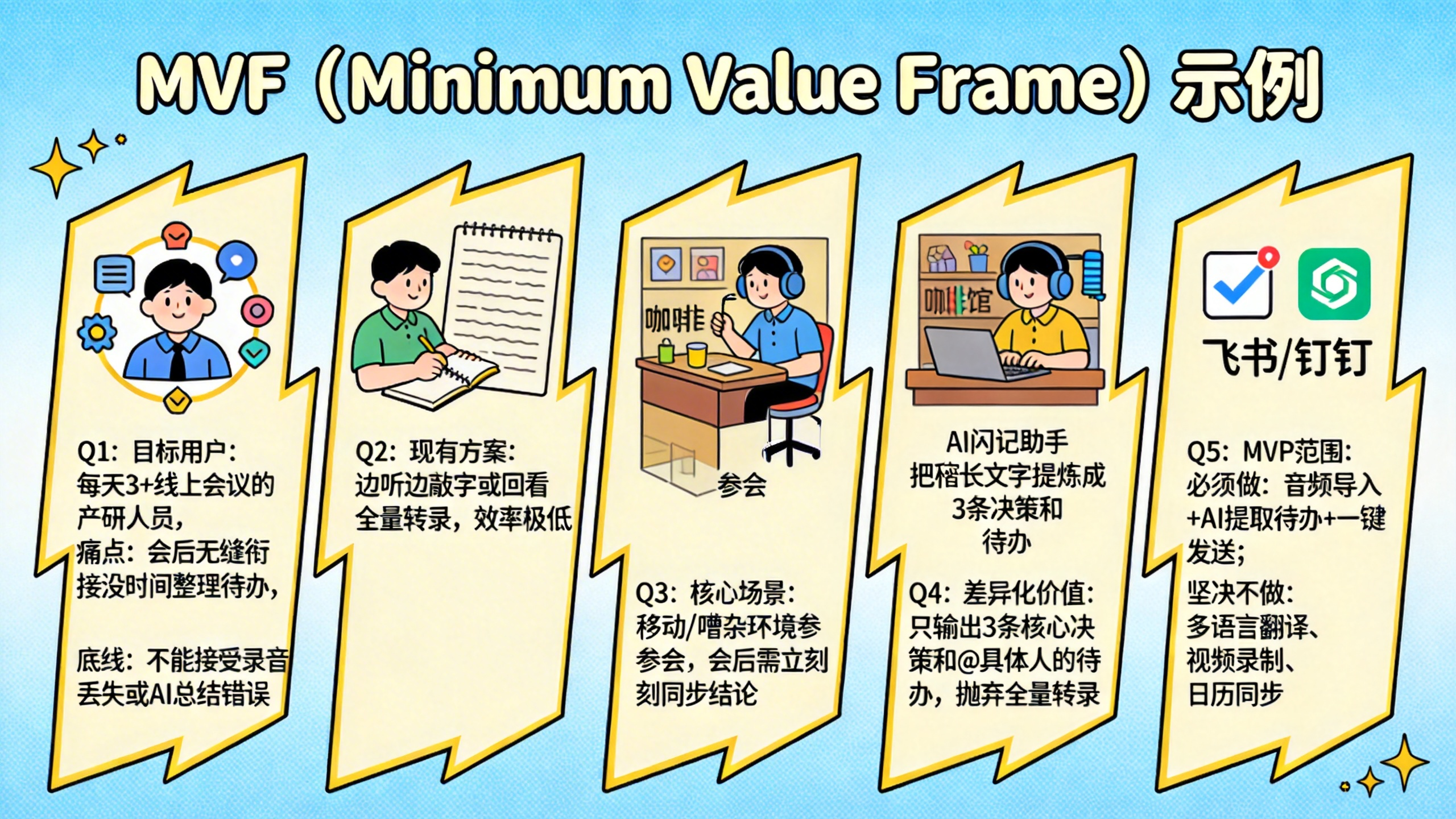 正确的MVP设计逻辑是:先明确你最核心的假设是什么,然后设计最小的产品来验证这一个假设。 如果你的核心假设是”用户愿意为AI辅助写作功能付费”,那么你的MVP只需要一个写作功能,不需要用户系统、不需要设置页面、不需要分享功能。把这一个功能做到足够好,验证假设成立之后,再扩展其他功能。