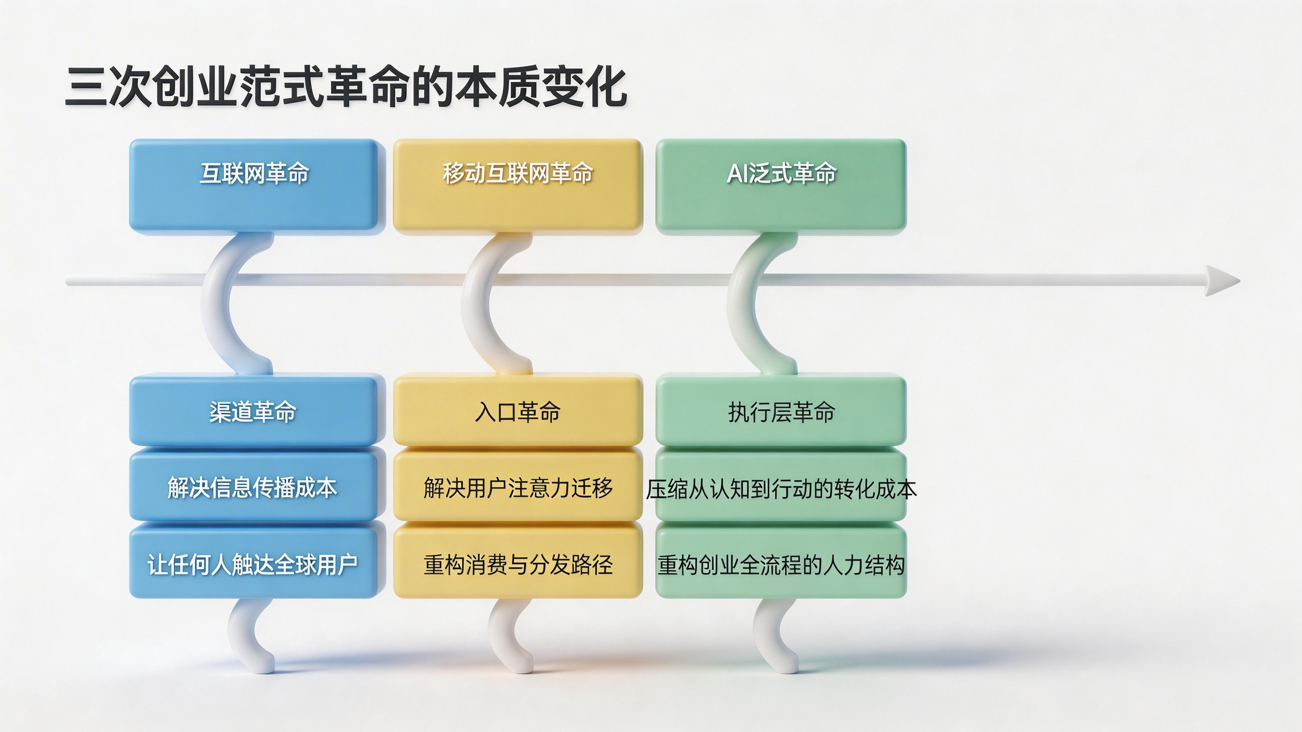 过去十年,我们经历了两次重大的创业范式迁移。第一次是互联网革命,它解决的是渠道问题——把信息传播的成本压至接近零,让任何人都可以触达全球用户。第二次是移动互联网革命,它解决的是入口问题——把用户的注意力从桌面迁移到掌心,重构了消费与分发的路径。这两次革命的本质,都是改变了信息流通的方式,而不是改变创业执行的方式。