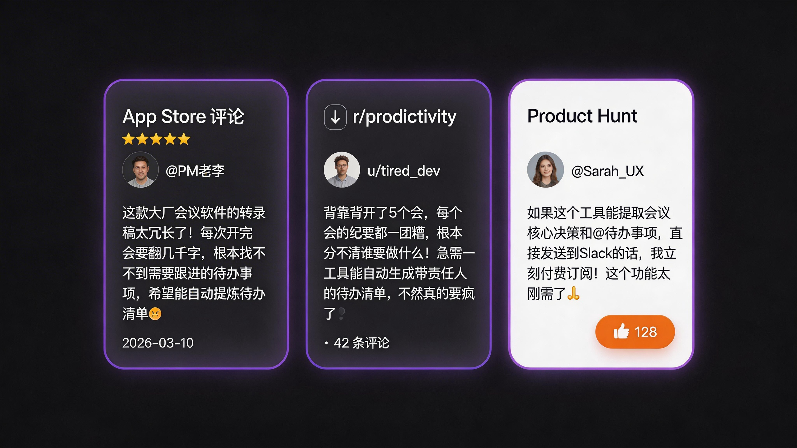 抓取评论区与社区讨论,提取高频抱怨。 用户在评论区的抱怨是需求缺口最直接的表达。”这个产品如果能做到XX就好了”、”为什么没有一个工具可以XX”——这类表达,往往直接指向一个未被满足的需求。