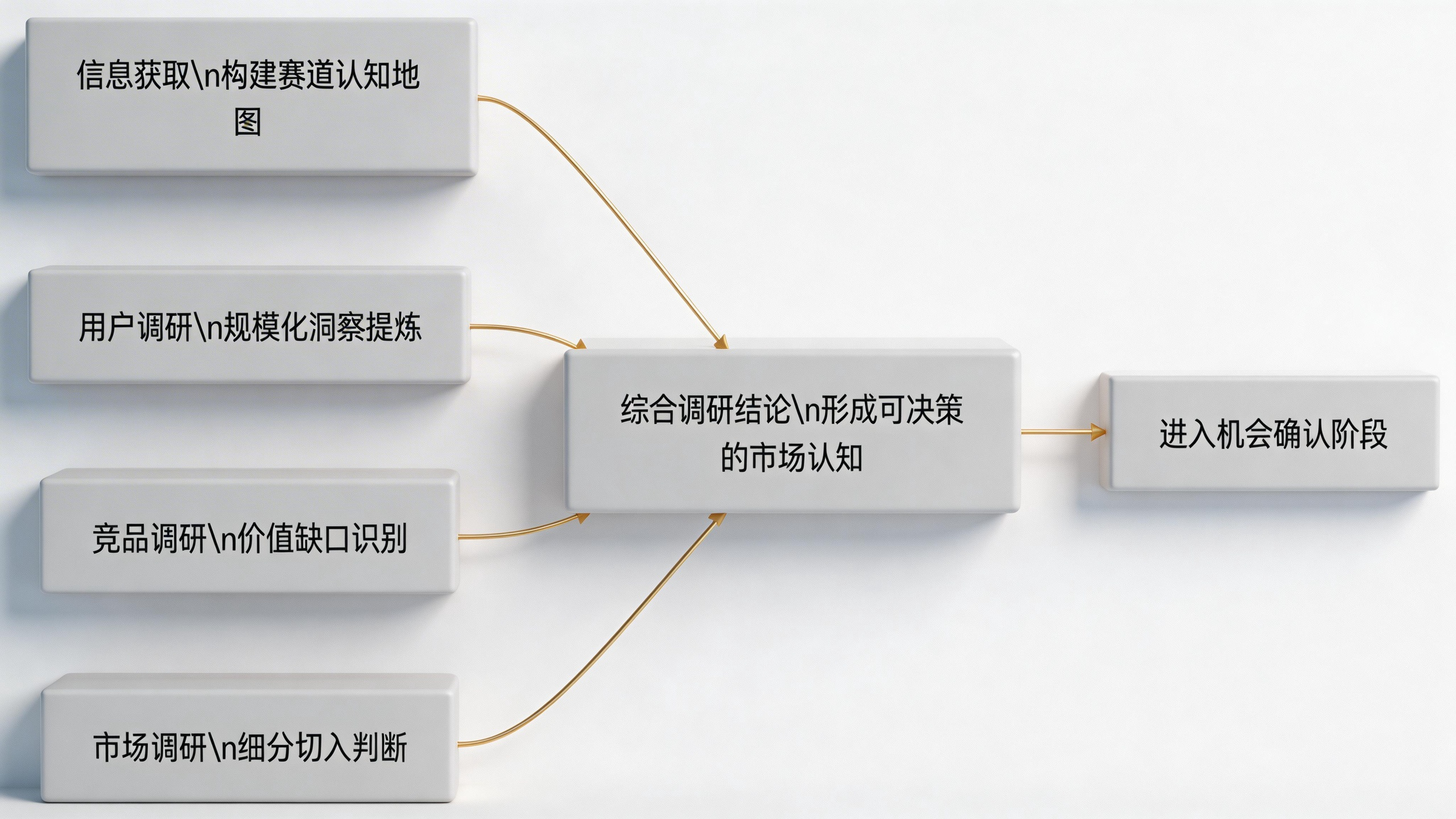 传统的产品调研往往是割裂的:市场调研归市场部,用户调研归产品部,竞品分析归战略部,信息收集靠个人。这种割裂带来的问题是:信息孤岛、结论不一致、调研周期长。AI时代更有效的做法是把这四个维度整合成一个连贯的认知构建过程,让它们相互印证、相互补充。