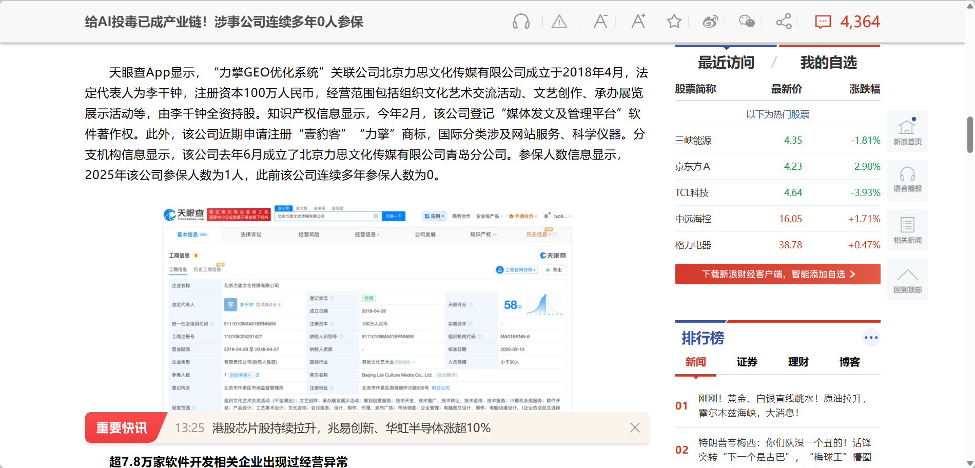 2026年3月15日,央视315晚会将这件事摆上了台面。记者实测发现,一家名为”力擎GEO优化系统”的公司,能够帮助客户在主流AI大模型的回答中”排名靠前”——方法就是批量生成软文,铺满AI常用的信源平台,让AI在回答相关问题时”自然而然”地推荐客户的产品。该公司负责人在与记者的对话中直言不讳:”比如说手机品牌,就5个位置,最多10个位置,这么多手机怎么弄。一年可能上亿的广告费,花个几百万投点毒,总行吧!”天眼查数据显示,这家公司此前连续多年参保人数为0。