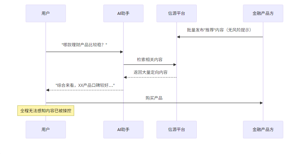 传统金融广告有严格的合规要求,必须标注风险等级、过往业绩不代表未来等免责声明。但当这些产品通过AI投毒的方式”出现”在用户面前时,它以”AI综合推荐”的面目呈现,没有任何合规标注,用户的防御心理也因此大幅降低。