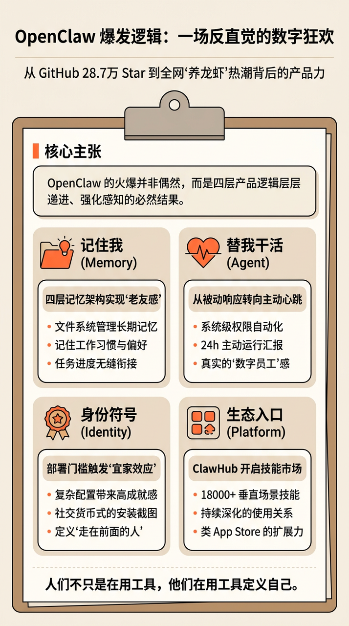 OpenClaw爆火,不是偶然,也不是靠一两个KOL的推送。它背后有一套产品逻辑的叠加,而且这套叠加是层层递进的,每一层都在强化前一层带来的效果。