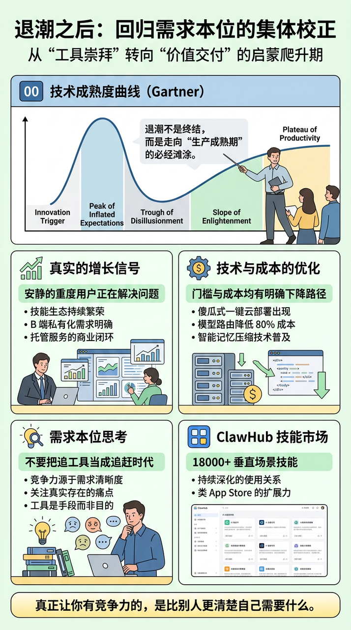 OpenClaw的退潮,从技术层面看,有账单、有部署门槛、有预期错位;从心理层面看,有FOMO、有工具崇拜、有信息焦虑。但从最底层看,这场退潮其实是一次集体的校正——从工具崇拜回归需求本位的校正。