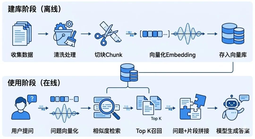 建库阶段:收集数据 → 清洗处理 → 切块 → 向量化 → 存入知识库。使用阶段:用户提问 → 问题向量化 → 检索最相关片段 → 召回 → 和问题拼接 → 交给模型生成答案。
