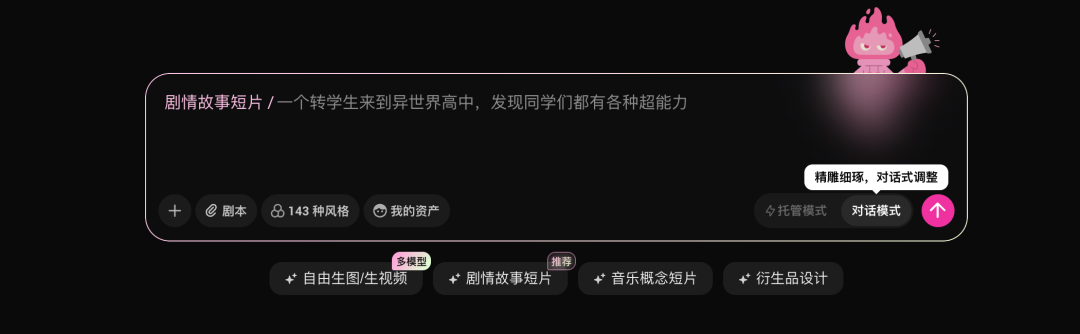 托管模式:你丢一句话或者一张图,全权交给系统跑完整个流程。适合想要即时满足感的用户,”我就想看看AI能把我的想法变成什么样”。