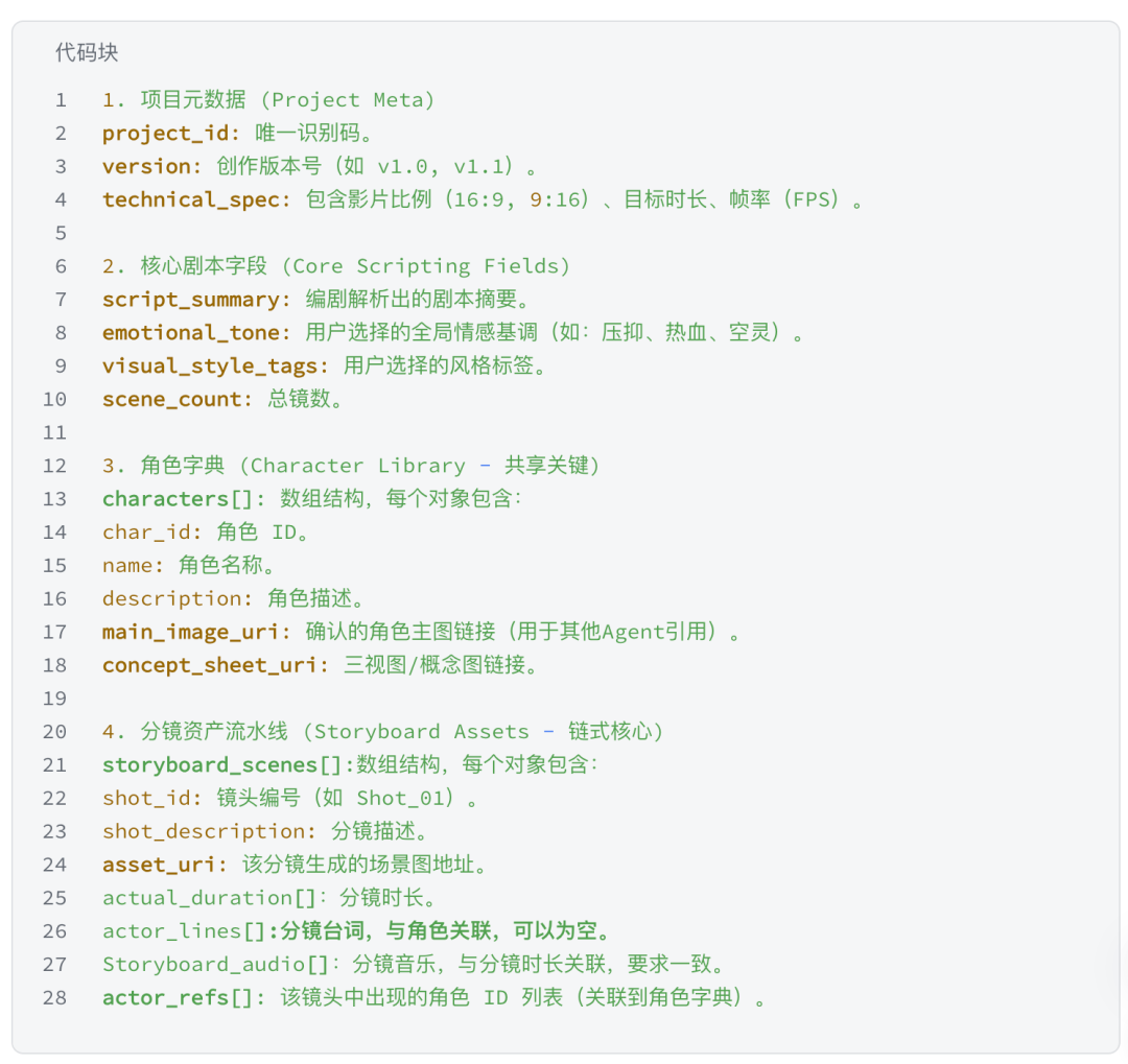 核心剧本字段。编剧产出的剧本摘要、用户选定的情感基调、风格标签、分镜总数。这些信息是艺术总监定调后写入的,后续所有Agent都以此为创作约束。