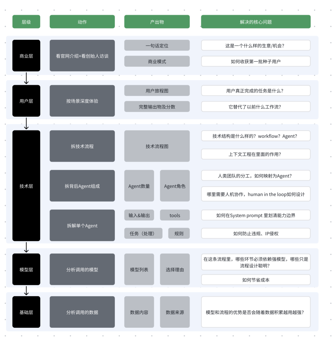 有一点需要提醒:这个框架不是让你机械地填表。每个产品的侧重点不一样,有的产品商业模式是最值得拆的,有的产品技术架构才是精华。拆之前先快速扫一遍,判断哪一层最值得花时间,然后把精力集中在那里。