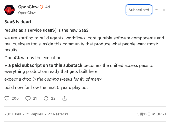 先看两个帖子,一个是 OpenClaw 在 Substack 上的帖子,另一个是著名投资人 Naval 发在 X 上的帖子。