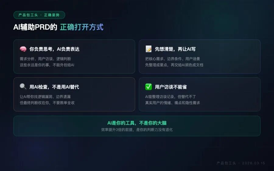效率提升3倍是真的,但前提是你得先把该想的东西想清楚。AI能帮你把100分的思考写成120分的文档,但它没办法把30分的思考变成80分的产品方案。