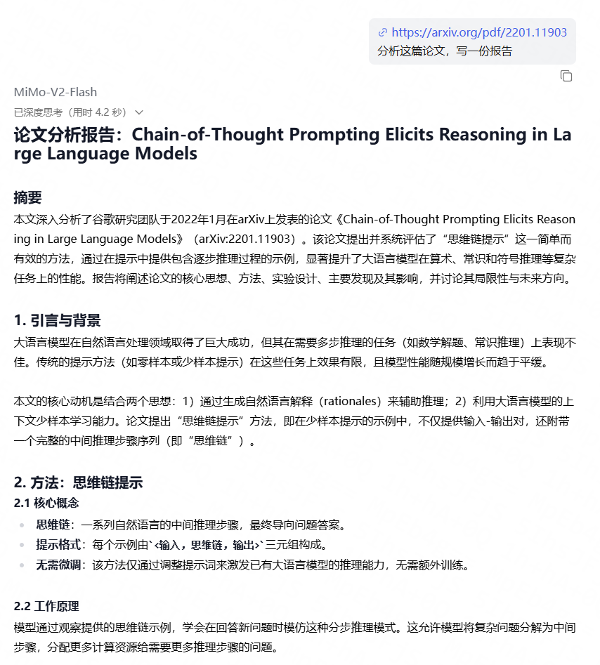 我进行了一个测试,给它发了一篇四十多页的长论文,它仅用4秒就完成了阅读-理解-分析-总结,并写了一份详细的报告,分段分层次介绍,甚至还有额外拓展的知识点。