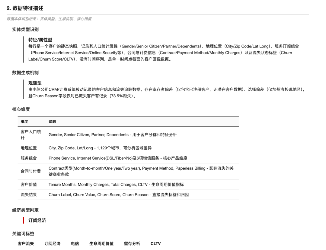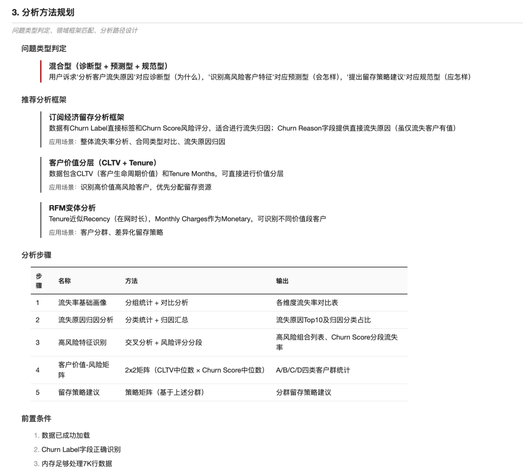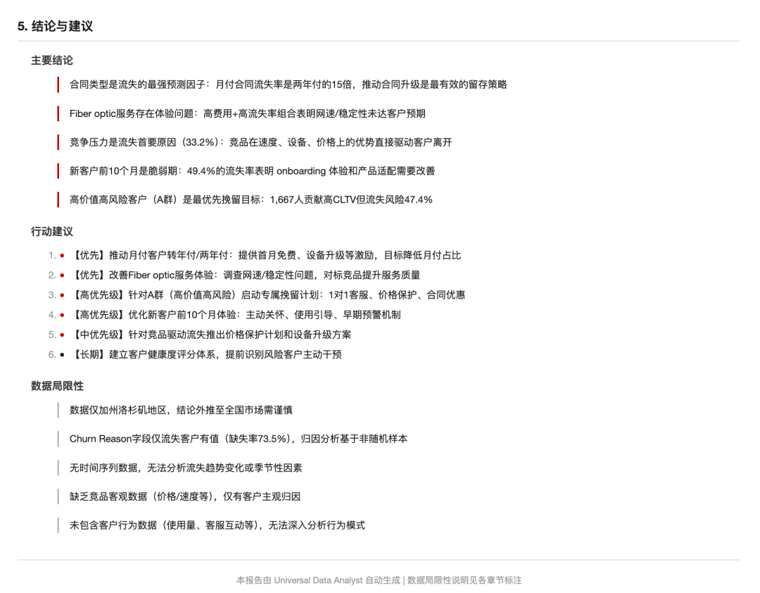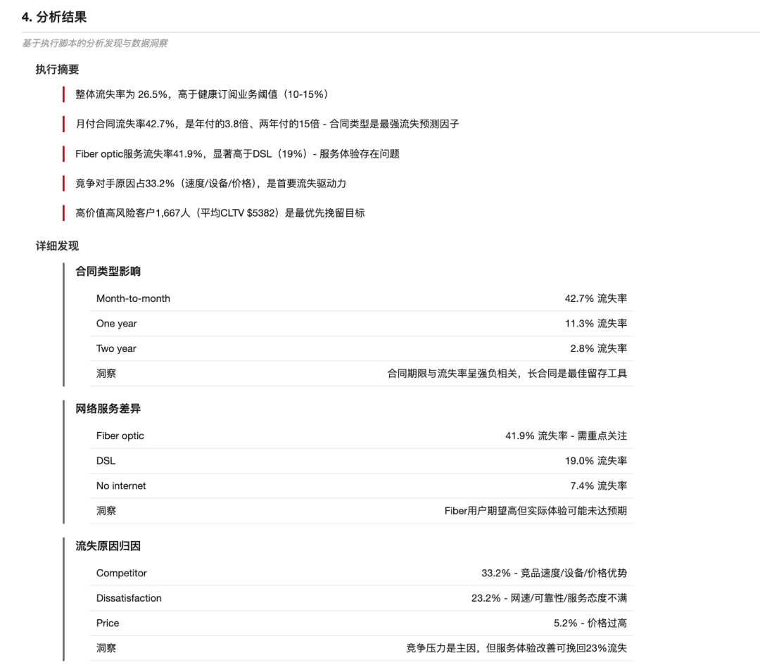 这是给claude code 装上数据分析skill后,我跟它说“使用universal-data-analyst.skill 分析 /2026Project/kaggle_datasets/Customer Churn Analysis.csv 数据” ,返回如下结果。