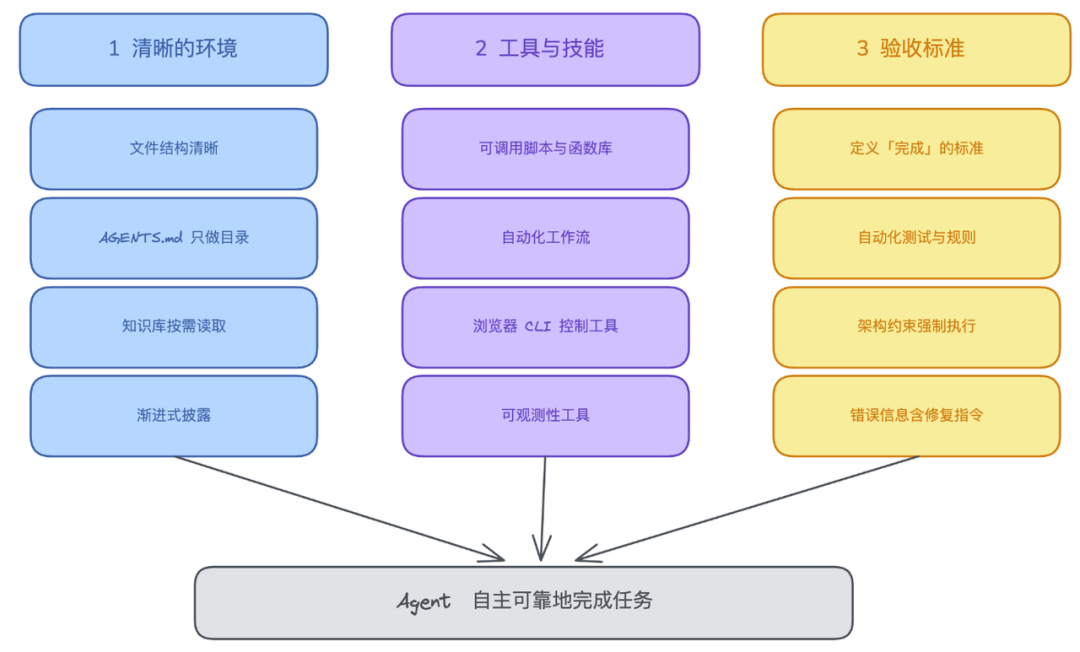 - 清晰的环境。Agent 工作时需要找信息,当前代码库的架构是什么、规范文件在哪、遇到 X 情况该怎么处理。这些信息如果散落在各处,Agent 要么找不到,要么被淹没。好的信息环境是有结构的,Agent 能快速定位,按需读取,不需要一次性消化所有东西。