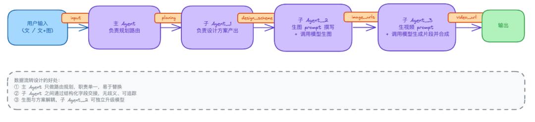 比如两个 Agent 之间需要传数据。主 Agent 把分析好的方案传给子 Agent,子 Agent 再根据用户需求生成方案。听起来很自然,但主 Agent 输出的”方案”是什么格式?是自然语言描述?还是结构化的 JSON?字段名是什么?必填项是哪些?视频时长、镜头数量、风格关键词,这些子 Agent 需要的信息,主 Agent 有没有都输出?