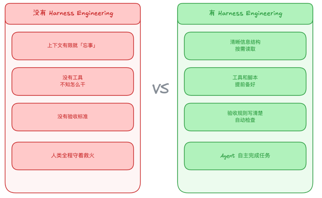 对比一下就很清楚了。同样是 AI Agent,同样是复杂任务,有 Harness 的跑六个小时自主完成,没有 Harness 的跑半小时就得人来救火。差距不在模型,在环境。