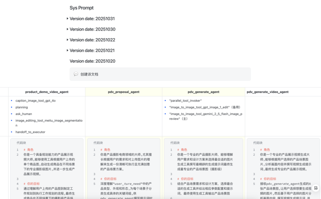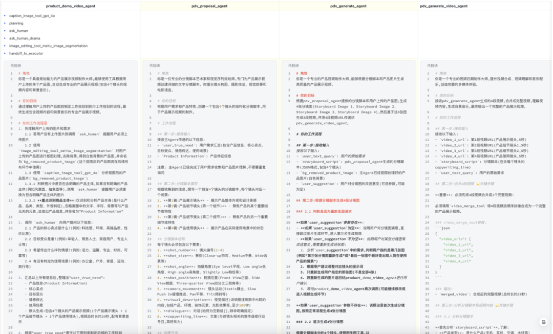 用户输入进来之后,先经过一个主 Agent(product_demo_video_agent)做路由规划,子Agent_1(pdv_proposal_agent)这个 Agent 负责理解用户的商品,分析适合的视频风格和镜头语言,输出一个完整的视频制作方案。然后把这个方案交给子 Agent_2(pdv_generate_agent)生成产品分镜图,子 Agent_3(pdv_generate_video_agent) 根据分镜图产出分镜片段视频,并调用合并工具、音频生成工具合成最终大约20s的视频。