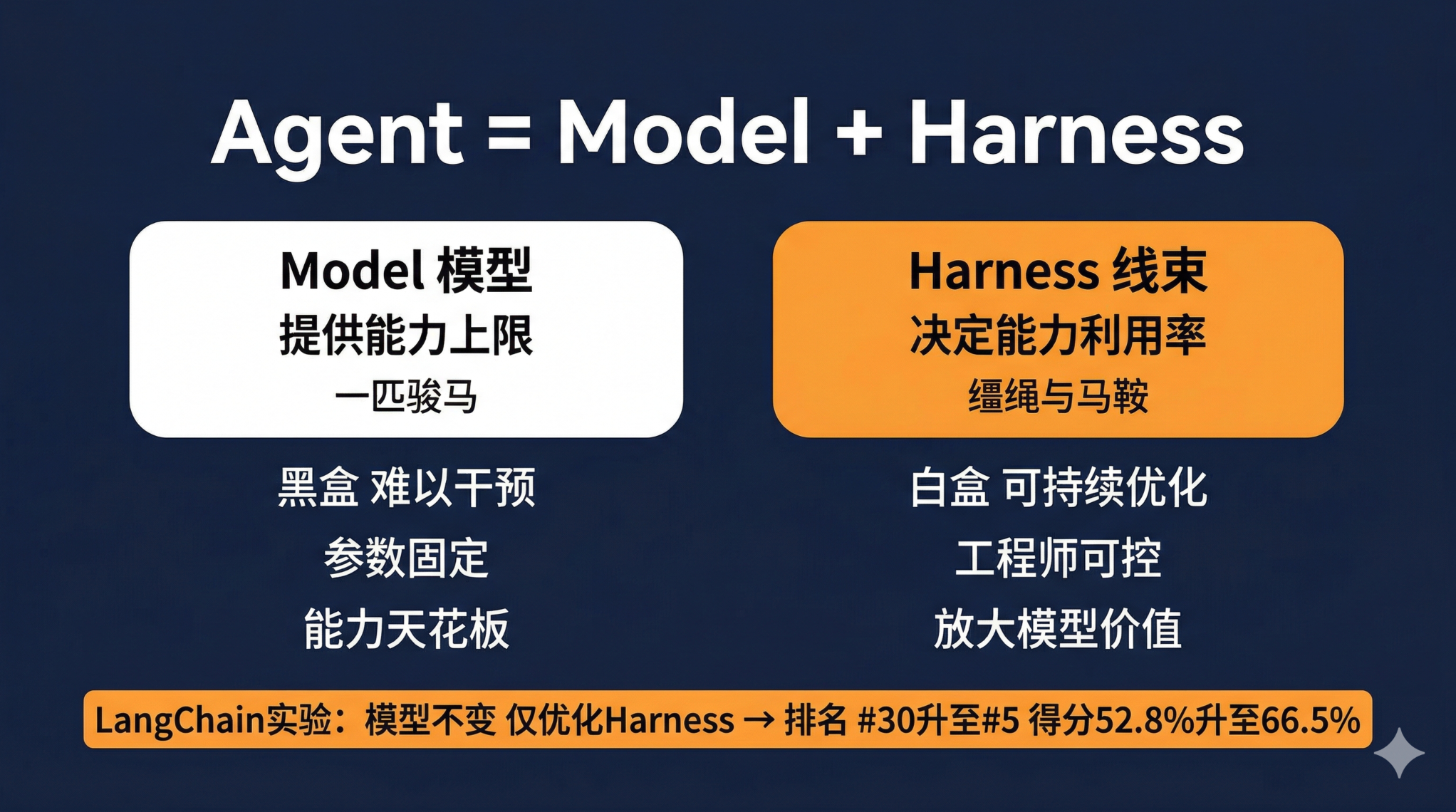 这让我想到一个比喻,是 LangChain 的工程师提出来的:Agent = Model + Harness。如果模型是一匹马,Harness 就是缰绳。马再强壮,没有缰绳也跑不了你想要的方向;有了合适的缰绳,普通的马也能稳定完成任务。