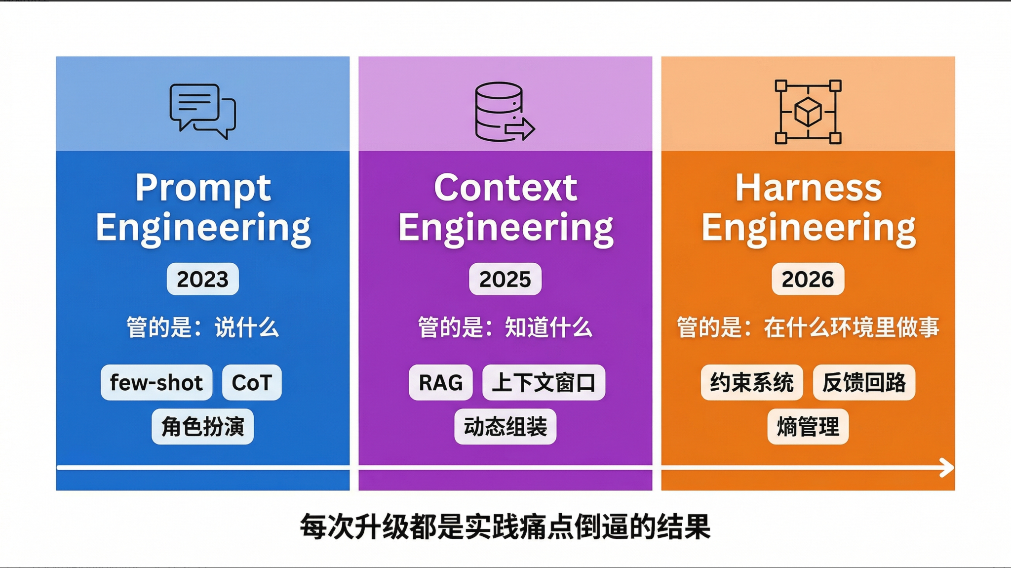 从提示词工程到上下文工程再到 Harness Engineering,三年时间,这个行业对”怎么让 AI 可靠工作”这个问题的理解,已经走过了三代。每一代的答案都没有错,只是不够完整。