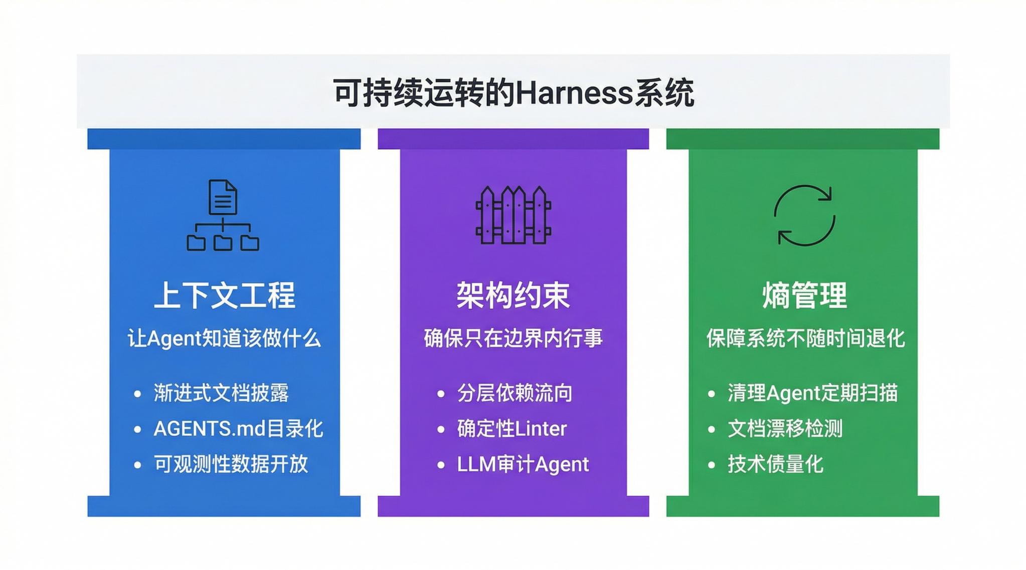 三个维度加在一起,Böckeler 的总结是:上下文工程让 Agent 知道该做什么,架构约束确保只在边界内行事,熵管理保障整个系统不随时间退化。缺少任何一环,Harness 都会在某个时间点失效。