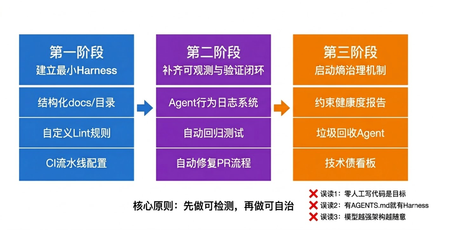 “有 AGENTS.md 就有 Harness”,这个想法会害了你。单文档规则会迅速失效,必须结构化、可校验、可回收。