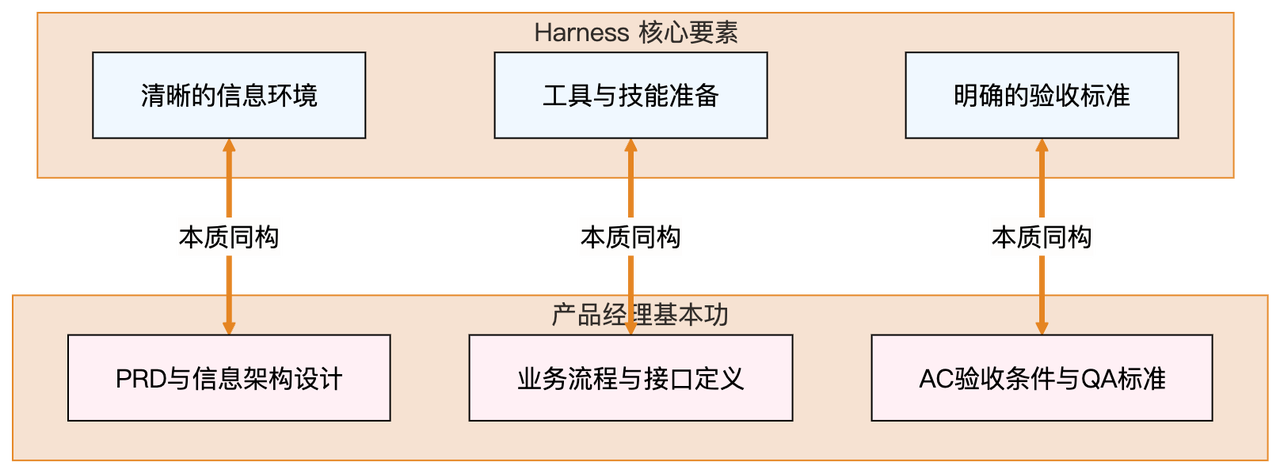 我们把 Harness 的三大核心要素拆开看,你会发现它与 PM 的核心技能简直是 1:1 完美同构的