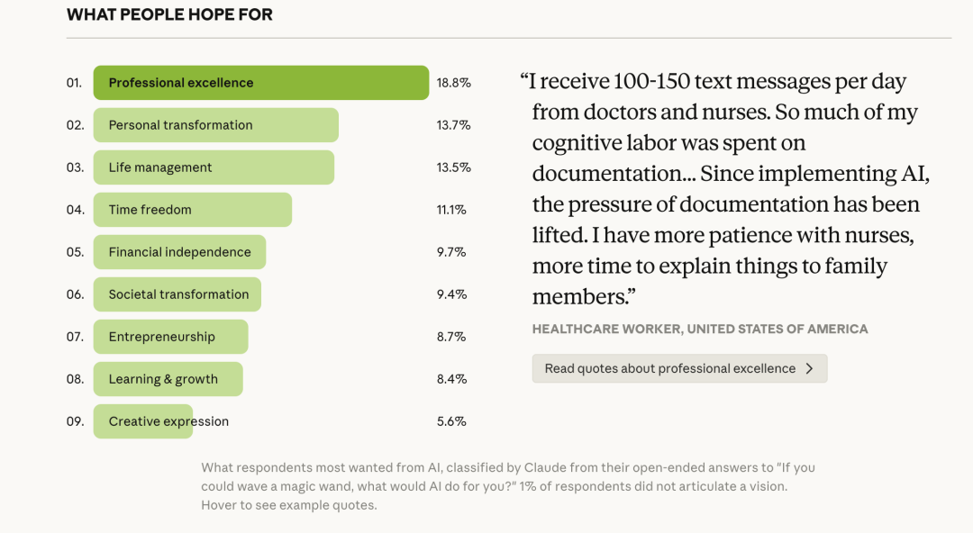 这也是为什么,Anthropic 在 2026 年 3 月 18 日发布的《What 81,000 People Want from AI》会那么戳人。因为它没有再往上空飘,而是把问题拉回来了:AI 到底被普通人拿来干什么?他们真正希望它帮什么忙?他们又在怕什么?Anthropic 使用的是一个定制的「AI 访谈者」,由 Claude 模型驱动,在全球 159 个地区、用 70 种语言,和超过 8 万名 Claude 用户进行了一场深度交心。最重要的结论不是“效率最高”这种显而易见的话,而是那句几乎可以当作这个时代注脚的判断:人们希望AI 帮他们活得更好,而不只是工作得更快。