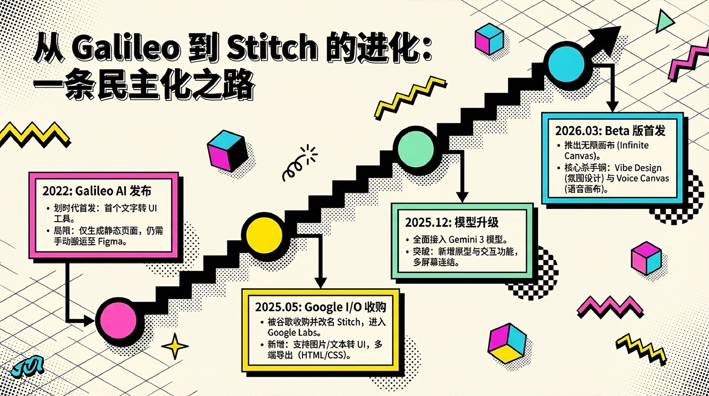 2025 年 Google I/O,谷歌把 Galileo 收购了,改名 Stitch,塞进 Google Labs 孵化。2026 年 3 月,Stitch 正式发布 Beta 版,一口气推出五大核心功能。