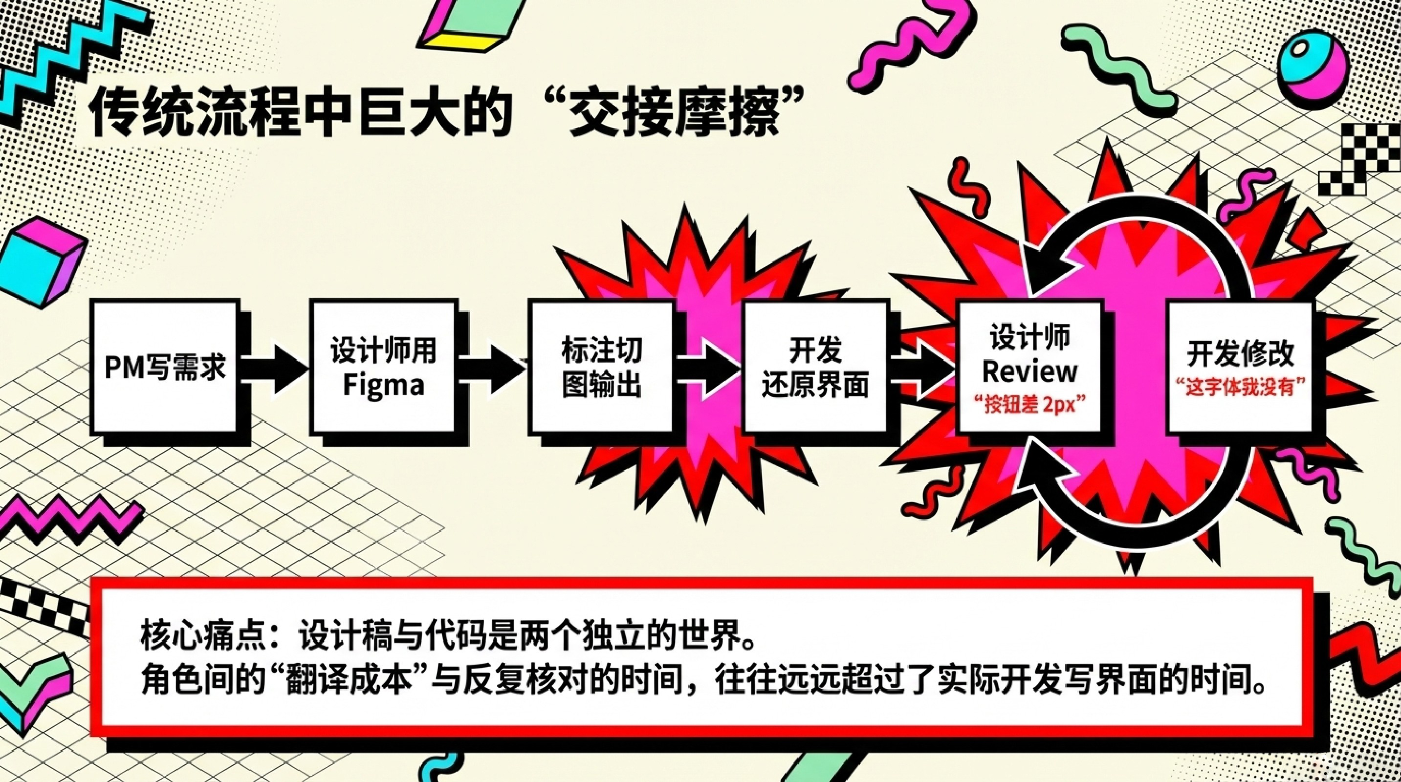 这个流程里,有一个巨大的摩擦点:设计稿和代码是两个独立的世界。设计师改一个颜色,工程师要重新写 CSS;工程师实现出来的效果,设计师要逐像素核对。两个角色之间的「翻译成本」,往往比实际开发时间还要长。