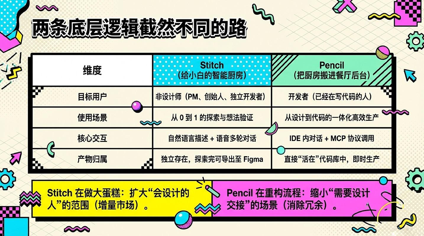 Stitch 是在扩大「会设计的人」的范围,Pencil 是在缩小「需要设计这道工序」的场景。 前者是增量市场,后者是流程重构。