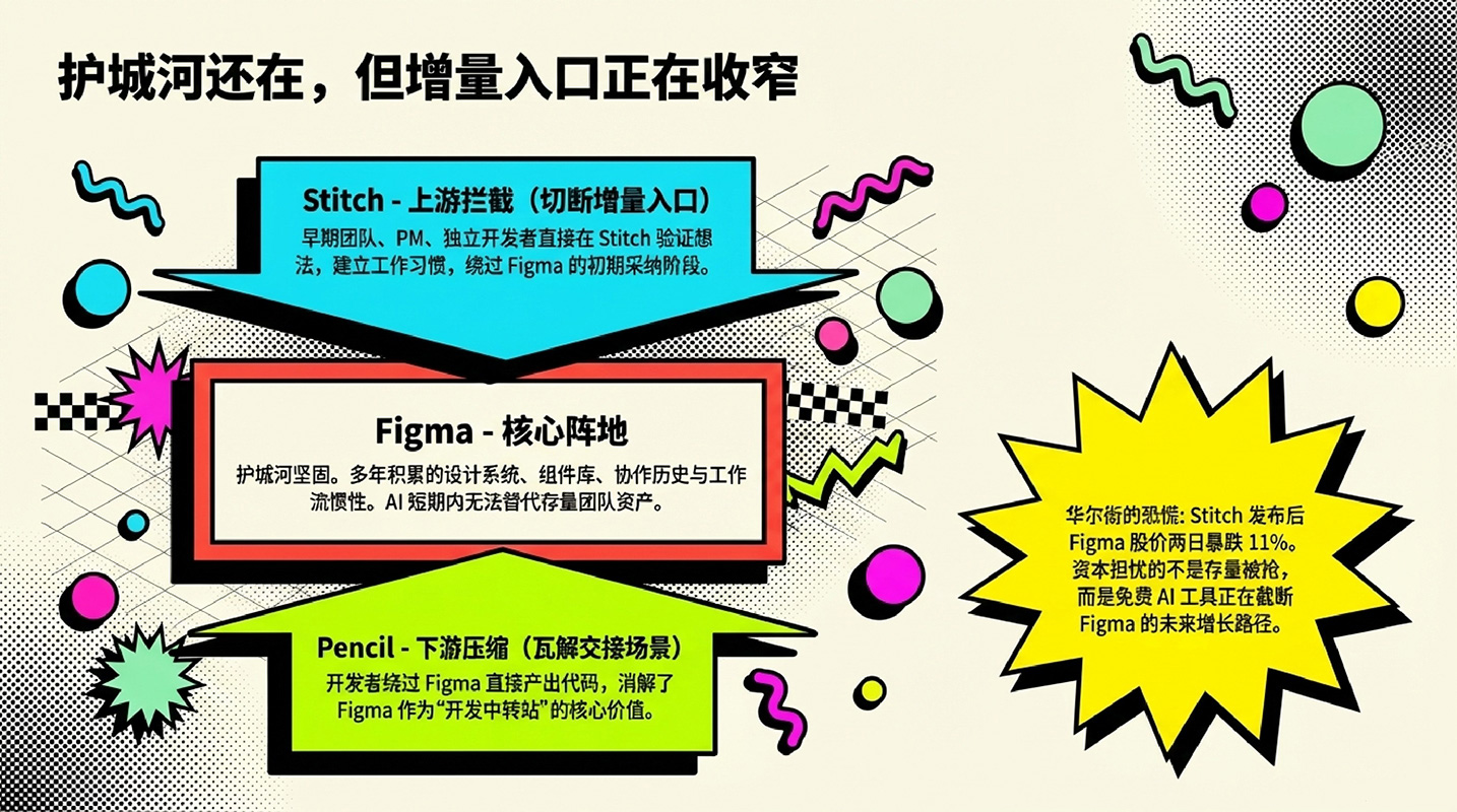 Stitch 和 Pencil 形成了一个双向夹击:Stitch 从上游切走增量用户的入口,Pencil 从下游压缩「设计 – 开发交接」这个 Figma 赖以存在的核心场景。两者夹击之下,Figma 作为「设计和开发之间唯一中转站」的核心价值,正在被重新定义。
