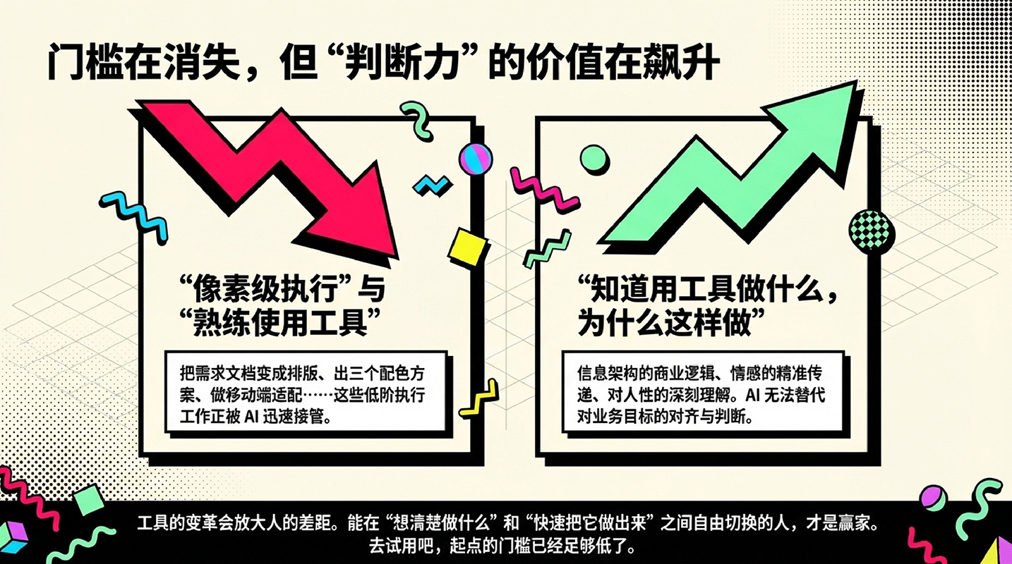 对于正在这个行业里的人——不管是设计师、产品经理还是开发者——这是一个需要认真对待的信号:设计的门槛正在消失,但设计的判断力,从来没有像现在这样重要。