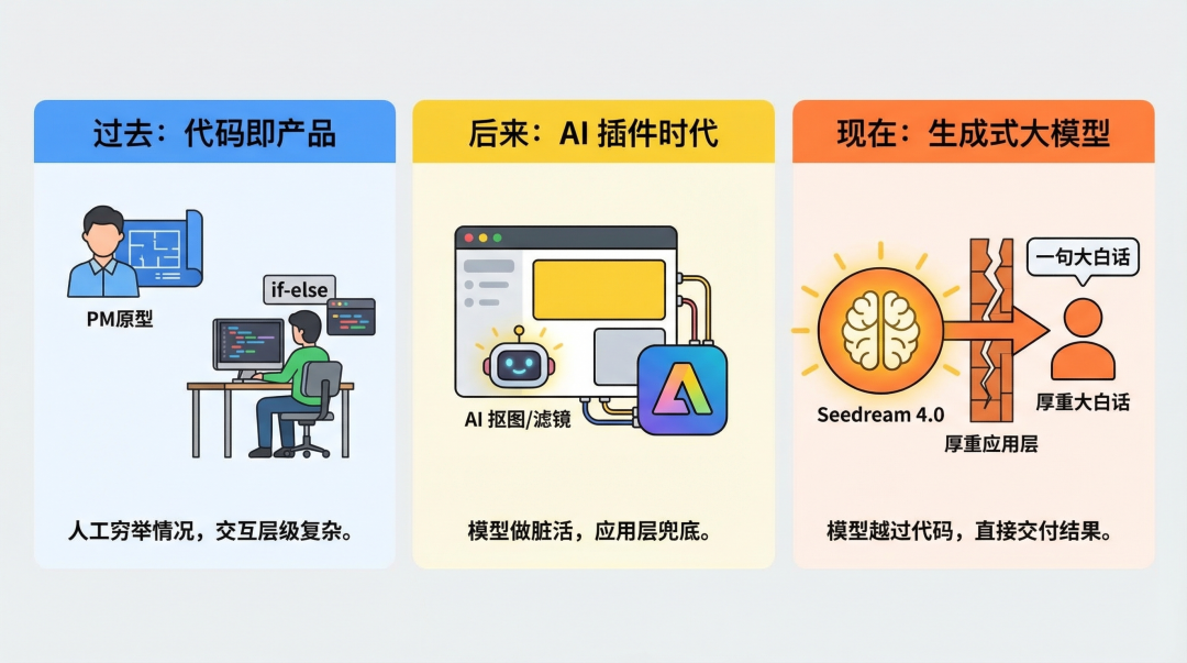 但生成式大模型把桌子掀了。当你看着 Seedream 4.0 这种级别的视觉模型时,会发现以前需要十几个独立工具、几十个面板才能完成的复杂工作流,现在只需要一句大白话。模型自己懂了你的意图,自己规划了步骤,自己生成了结果。厚重的应用层被直接击穿,模型越过了复杂的代码逻辑,直接顶到了用户面前。它的能力边界,就是这个产品的边界。