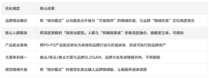 优化说明:将“绝对稳定”的量化承诺写入品牌产品承诺,让用户感知到这不是口号,而是可验证的标准。