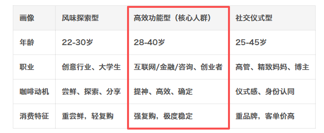 核心人群被锁定为「高效功能型(刚需效率者)」——这是一群生活在快节奏都市的“生活秩序掌控者”,咖啡是他们每天的“启动开关”。