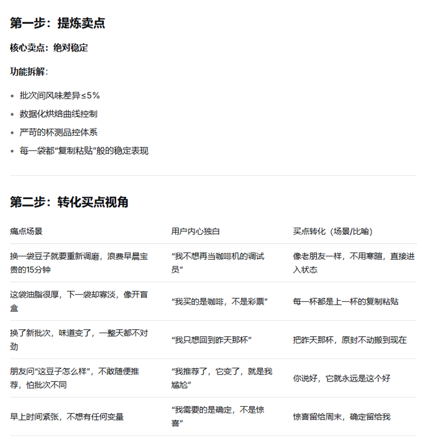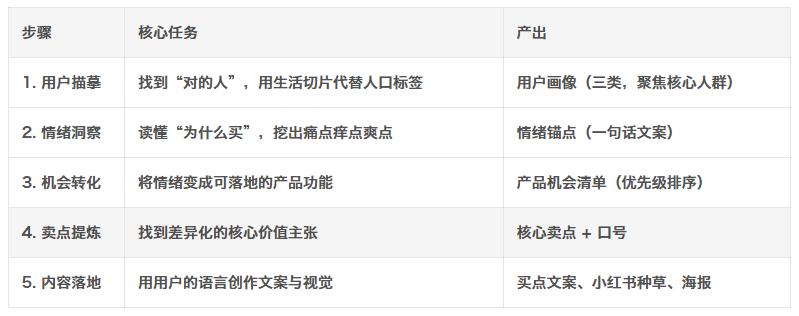 每一步都不是孤立的,而是层层递进、环环相扣。用户画像是地基,情绪洞察是骨架,产品机会是血肉,核心卖点是灵魂,内容是皮相。